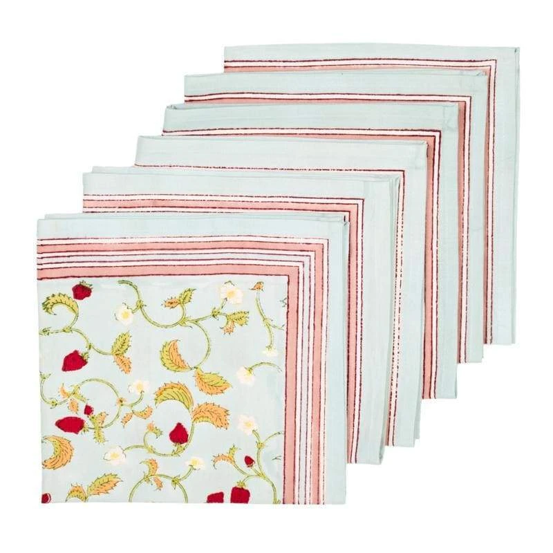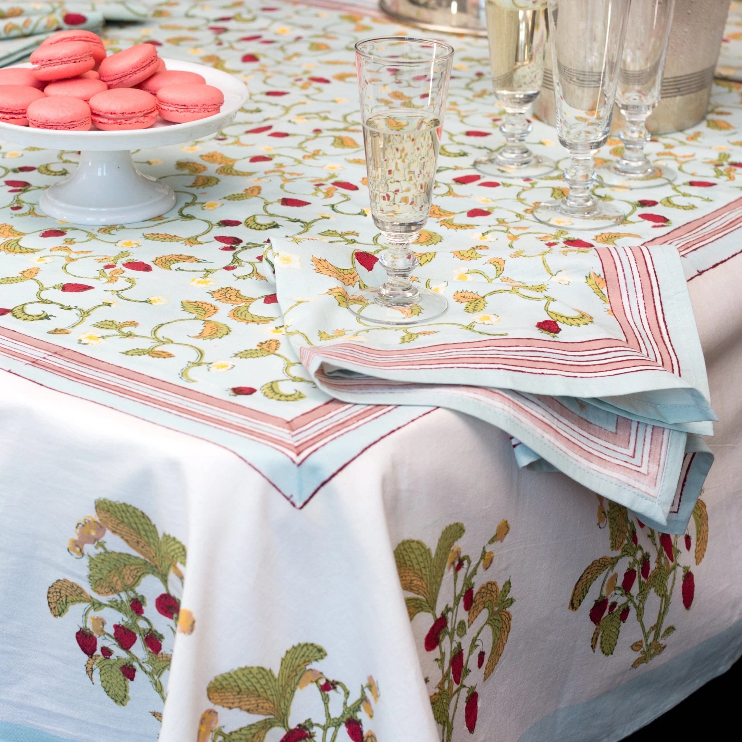 The phrase “wild strawberries” (fraises des bois) evokes a sense of golden summers amid the beauty of the countryside, so it’s appropriate that the Fraises des Bois collection features vibrant colors and botanic designs along with orderly patterns and a calm ivory backdrop. A charming complement to any table setting, these high-quality napkins are carefully handprinted by skilled artisans using a time-honored technique; learn about the process here.