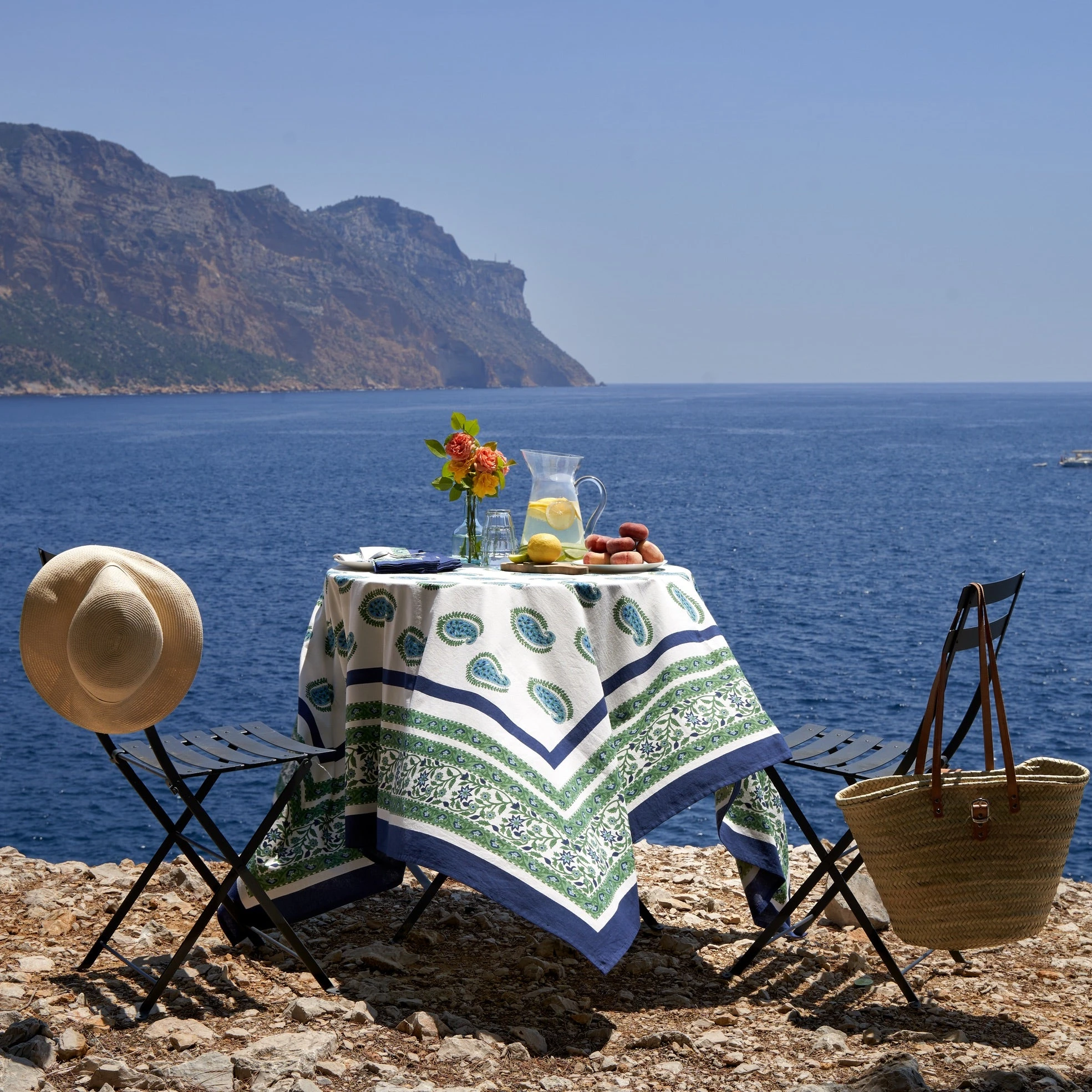 Featuring the bold blues and greens found along Provence’s stretch of sea, the Cassis Blue & Green Collection is as delightful as the charming port village it’s named after. Whether you’re dining indoors or out, you’ll want to enjoy a long meal over this setting as if you were watching the boats and passersby in Cassis. Hand-printed by skilled artisans, using a time-honored technique, results in a singular piece of craftsmanship.