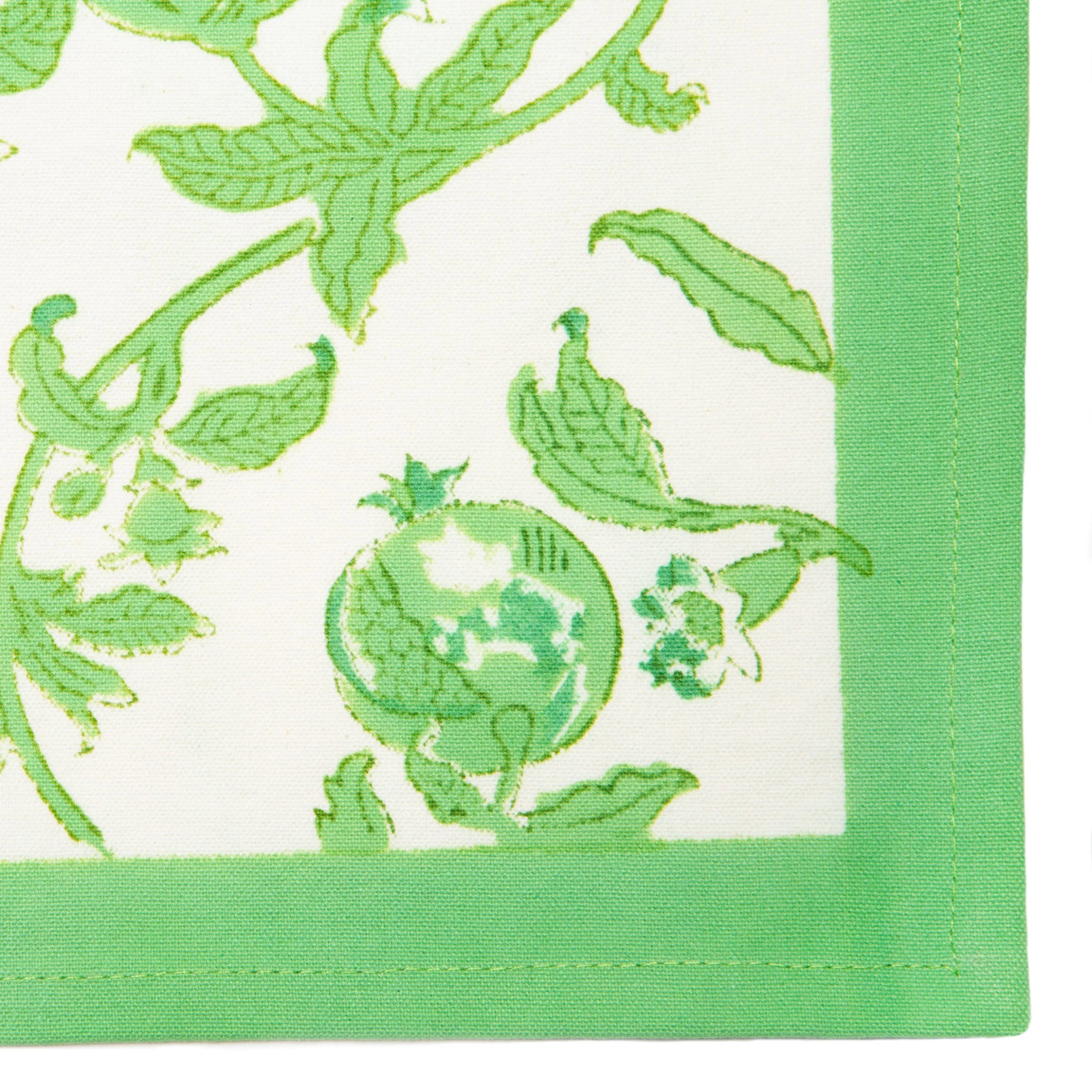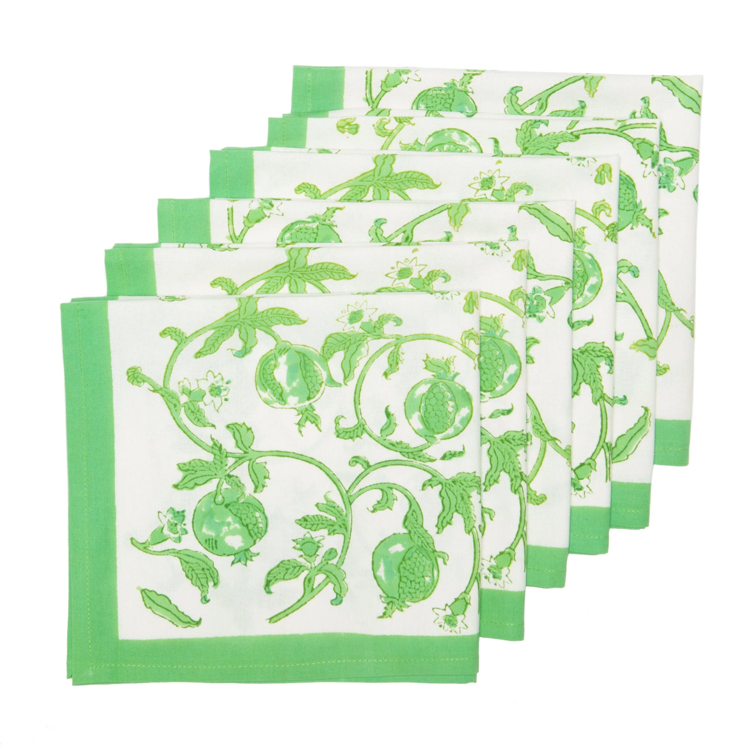 These eye-catching napkins feature a lovely botanical motif in an exquisite shade of green – a nod to the famous green parrots found throughout Northern India, which is where these linens were made. The imagery of curling vines and blossoming plants provides a charming backdrop to any meal, and each of these high-quality linens is hand-printed by skilled artisans using a time-honored technique, resulting in a singular piece of craftsmanship.