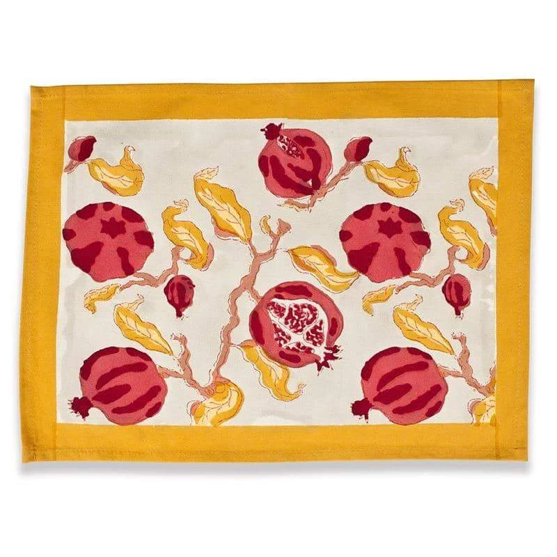 The Pomegranate Collection invigorates a neutral room or a chilly evening’s candlelit supper. Jewel tones of ruby red and citrine yellow highlight these linens. Use the tea towels or table runners to add color and style to the kitchen or foyer. Fine French table linens, hand-printed.Â